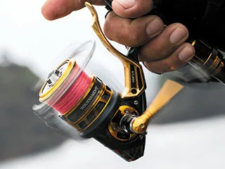 New shape spool edge is adopted, while maintaining trouble-free property, line release performance is improved. Since the line is released smoothly, the yarn dandruff at casting is less than before, further light gimmicks can further far throw. A line is drawn out straightforwardly against the flow of tide and the operation of putting out a thread, and it is possible to produce familiarity with a more natural gimmick.