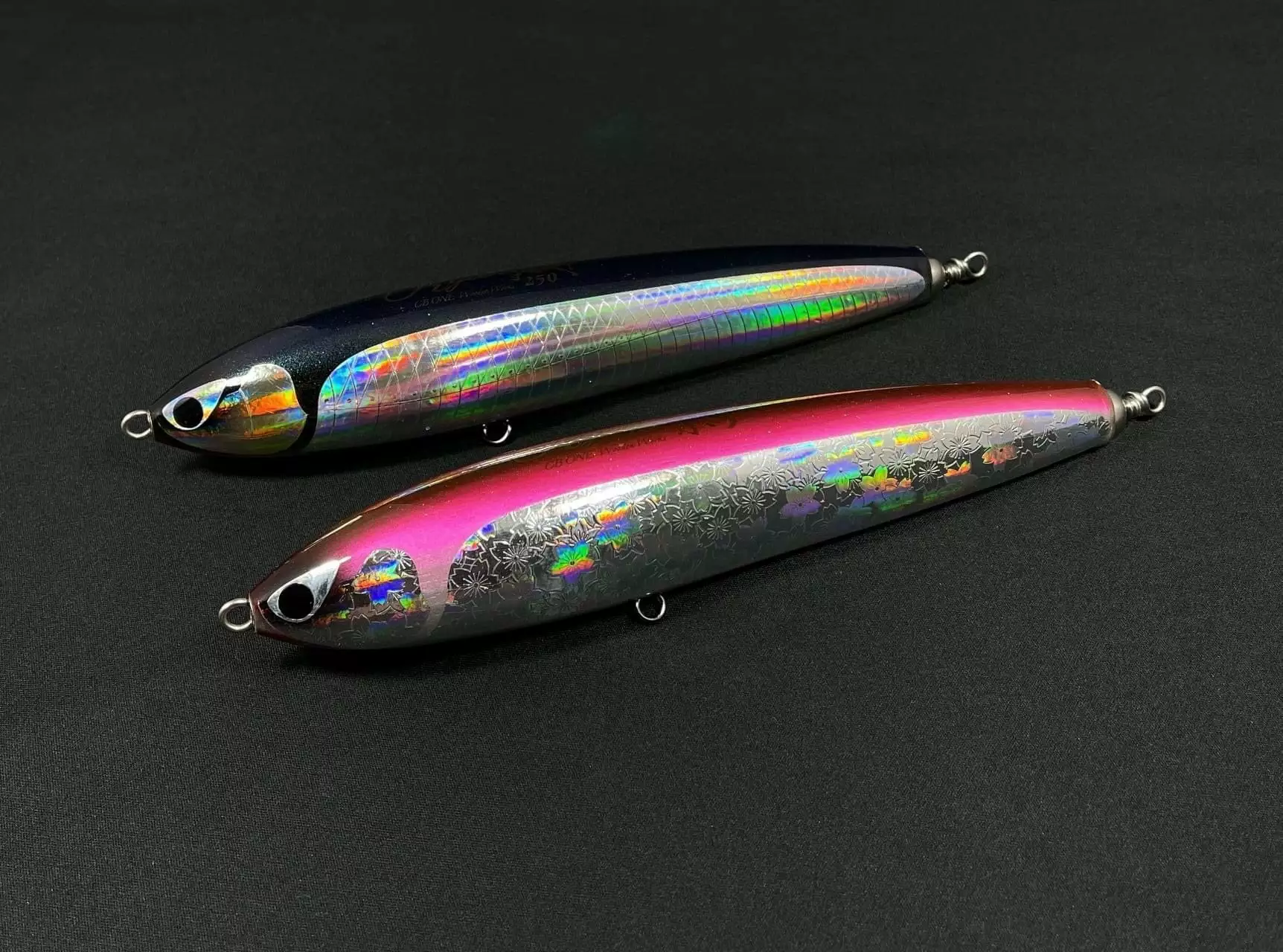 The CB One Ryan 250 stick bait is a work of art. These hand carved wooden lures feature a foil finish and a beautiful paint job. Designed to sit with its tail down at rest and create a nice bubble trail when pulled under the surface. The ‘S’ swimming action creates plenty of flash to imitate a fleeing bait fish. The Ryan 250F is an excellent lure for targeting GTs, Big Kingfish and Tuna. A must have lure for the enthusiast stick bait angler!!