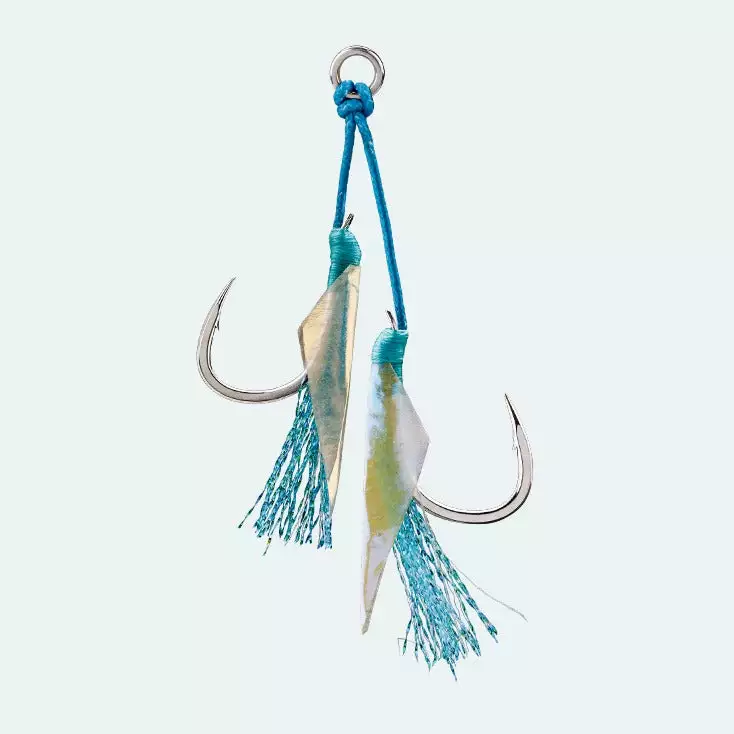 It comes pre-tied with BKK high quality solid core assist cord, which is very robust yet retains its softness. Shimmering and glowing fibers increase the attractiveness of the jig, triggering more strikes.