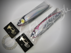 The CB One Ryan 200 stick bait is a work of art. These hand carved wooden lures feature a foil finish and a beautiful paint job. Designed to sit with its tail down at rest and create a nice bubble trail when pulled under the surface. The ‘S’ swimming action creates plenty of flash to imitate a fleeing bait fish. The Ryan 200F is an excellent lure for targeting GTs, Big Kingfish and Tuna. A must have lure for the enthusiast stick bait angler!! Â