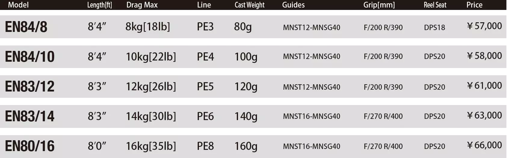 EN80 / 16 enables head-to-head matches with various super-large fish such as Sanuki, Goto, Hiramasa over 20 km from Tsushima, GT games at super-difficult places, Ibaraki, Monster Kihada off Mie. Ryan 230/250, Zoro 270, 100 ~ 140g heavy plug is the best match. Action with less physical stress that can be swept through the day even with PE8, 170 pound leader on a large reel. Supporting fulcrum position and smooth fulcrum movement that are difficult to extend even during super-high loads during fights.
