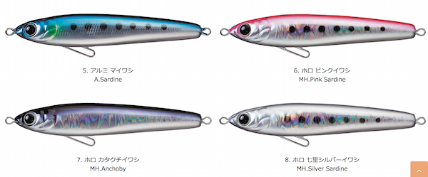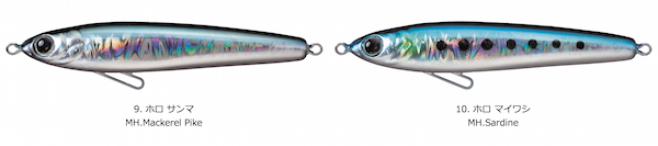 The jerking lure “Tide Bait Sardine” which is made of rigid foam, is a 15cm floating-type lure. The dives in from upright and floating position after jerking, interacts well with water and lures the target with irregular action.