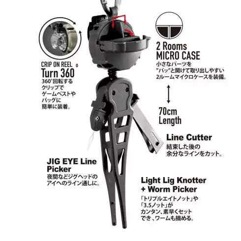 A multi-picking tool provided with a worm grip, jig eye line-through hole, and line cutter added with the Clip On Reel + Micro Case to set the Triple Eight Knot and the 3.5 Knot with ease and quickly.