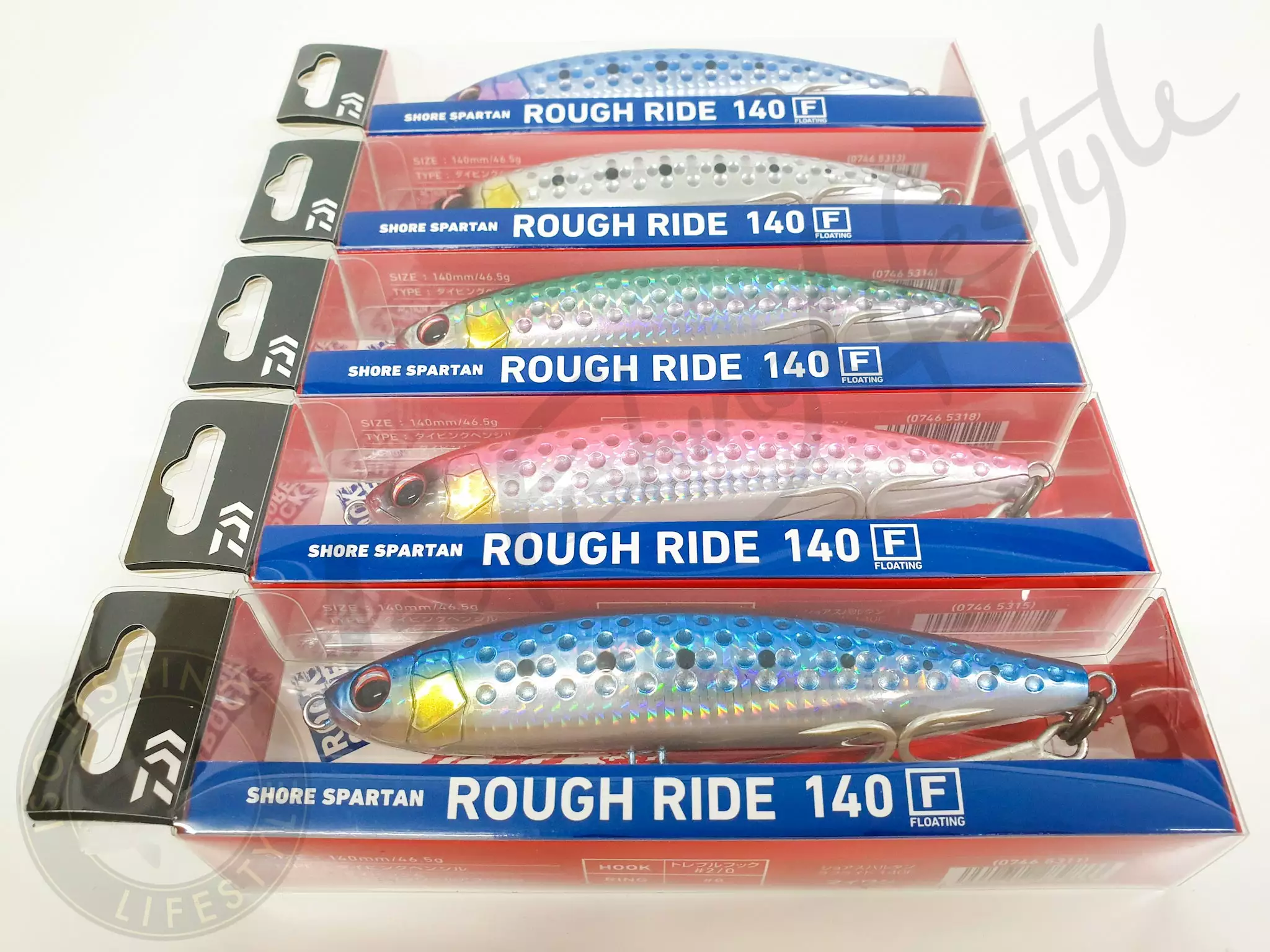 The Rough Ride 140F is the floating stickbait of the Shore Spartan range. The first thing to notice about all the Shore Spartan lures is their unique dimpled appearance. This golf ball-like design aids in aerodynamic and also hydrodynamic stability, improving long-distance casting and also stability in turbulent water