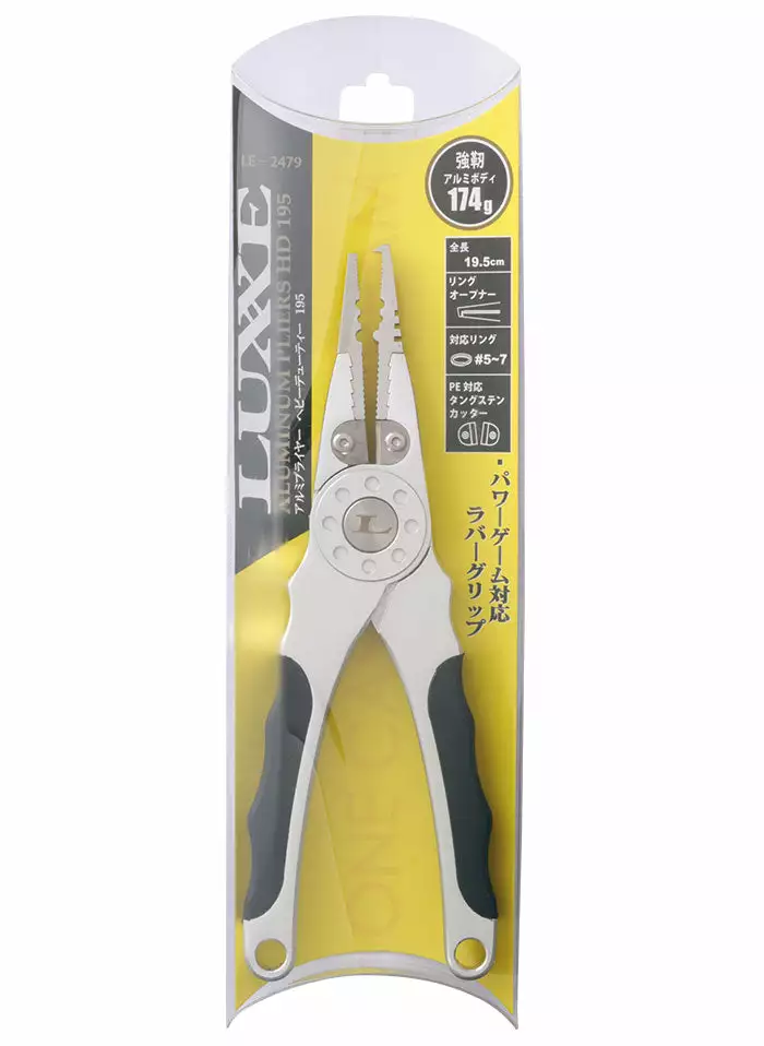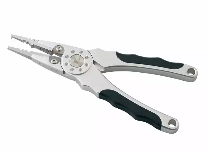 Designed a heavy duty plier for hook removing and opening split rings from a highly rust resistant stainless steel handles. Split ring sizes #5 ~ #7 are the ideal ring sizes to be used with this plier. The tungsten carbide line cutters built on the pliers can clean cut both PE and mono line. The rubber grip on the handles provides excellent grip even when wet with a smartly designed shape to hold comfortably.