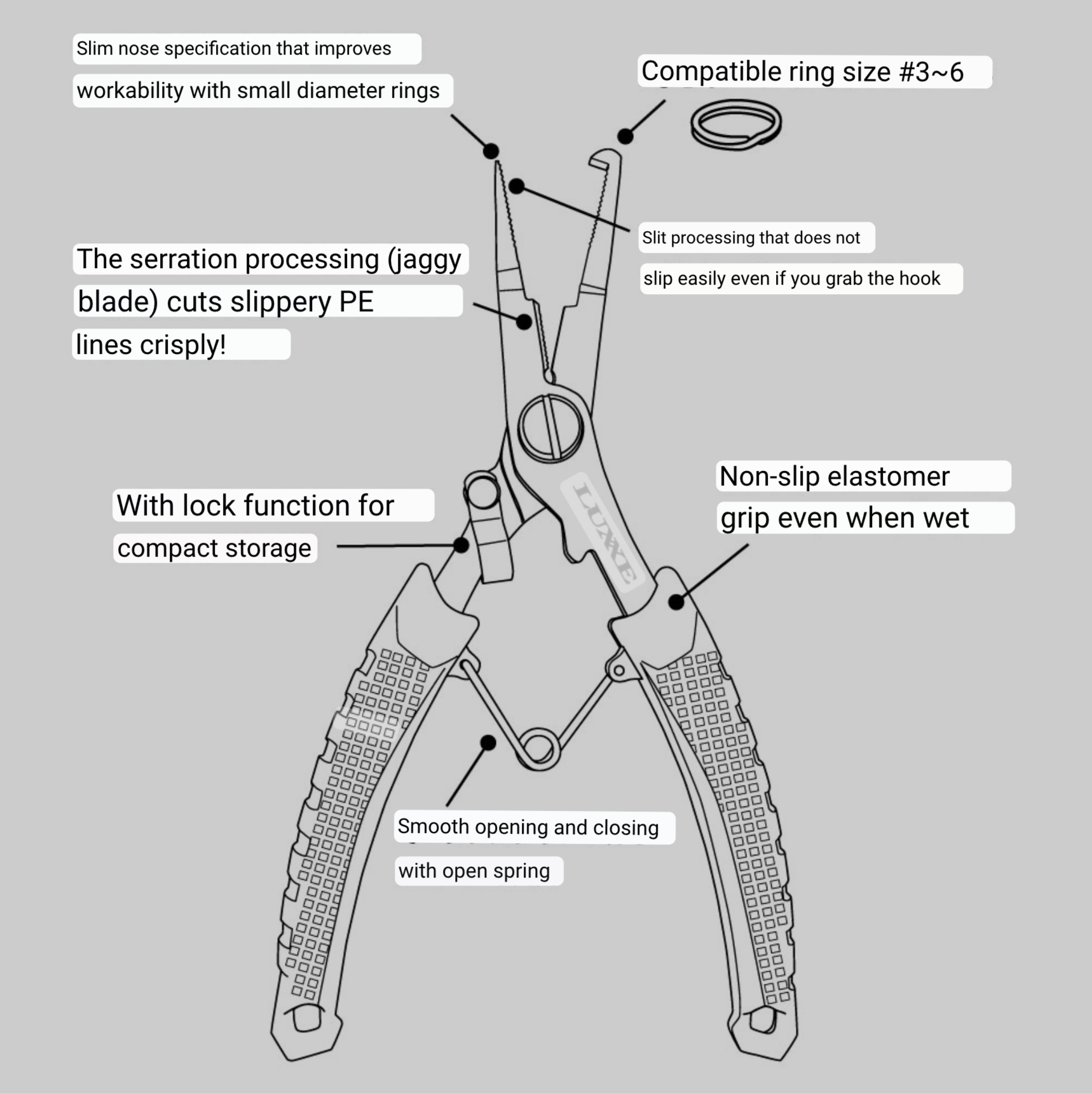The Gamakatsu Luxxe Split Ring pliers have been designed to comfortably open split rings from size #3 to size #6. These pliers also feature an anti-slip rubber hand grip with intuitive grooves which prevent slippage and allow for comfortable use. The PE line cutters are serrated which allow PE lines of all sizes to be cut comfortably and consistently.