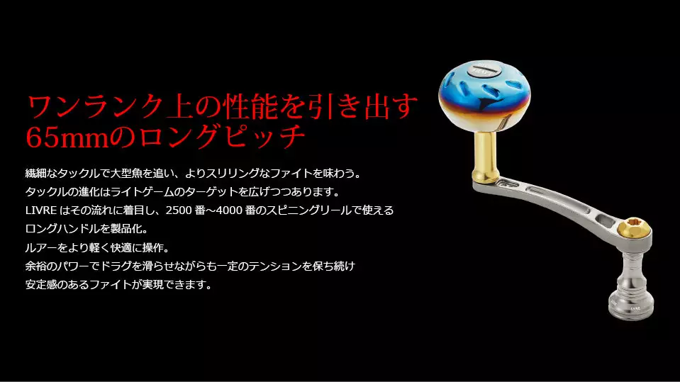 A custom handle + handle knob set by Livre Japan suitable for smaller sized reels for more crank and torque. The specially designed power handle will enable anglers to wind lures easier and have more control when fighting a fish.Â