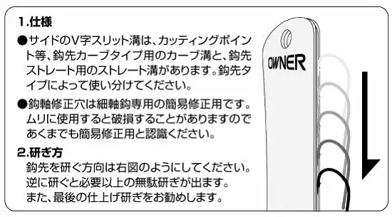 to sharpen ] The direction of sharpening the hooks should be as shown in the right figure. On the contrary, if you sharpen more than you need, you will get unnecessary waste. We also recommend a final sharpening.