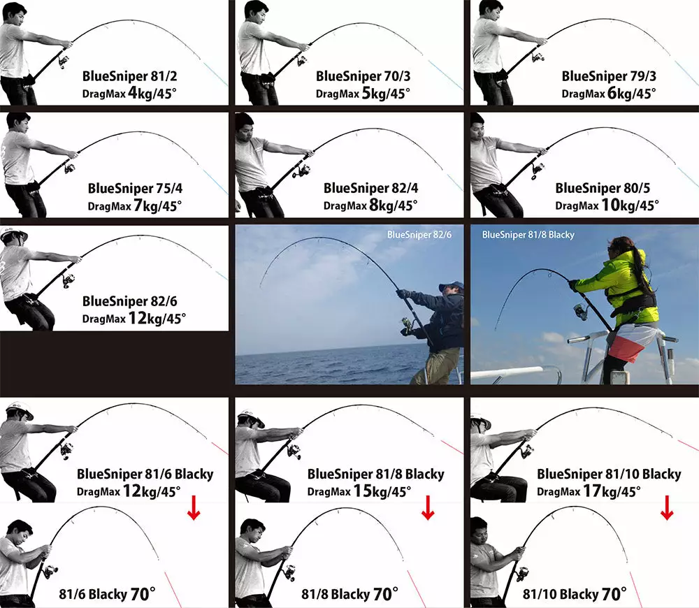 Rated at #10 for power, this rod targets big tunas around 100kg. The blank has more power than the 81/8 to enable casting lures up to 130gm. Like the Blacky series, it bends nicely when loaded to endure the violent runs of tunas. 4ways carbon material are used on the butt section to reduce twisting of the blanks adding another advantage during fights with big tunas.